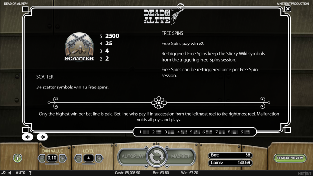 Dead or Alive – это слот с девятью линиями для выплат и пятью барабанами. На спин можно поставить от 1 и до 10 монет. В автомате Взять Живым Или Мертвым есть простые и специальные символы. Они выпадают на барабанах и формируют призовые комбинации на активных линиях. Чтобы получить выигрыш, на активной линии должно находиться минимум три одинаковых символа. В одном раунде может быть сразу несколько выигрышных цепочек, но учитывается только самая длинная. Выплаты по всем линиям могут складываться. Сумма выигрыша всегда зависит от размера ставки и коэффициента комбинации. В таблице выплат указаны все коэффициенты, а также последовательности. Множитель в игре может быть от х2 и до х1000. Характеристики аппарата: